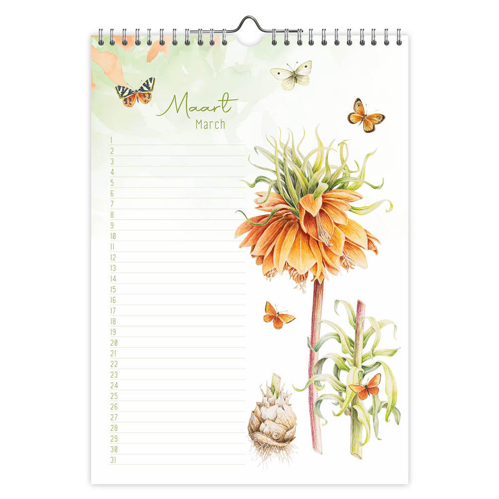 Deze stijlvol vormgegeven verjaardagskalender van Janneke Brinkman-Salentijn bevat elke maand een prachtige tekening van de botanische natuur. Al bijna 30 jaar maakt zij iedere maand een nieuwe aquarel van bloemen die haar op dat moment inspireren. Door de ringband is de kalender bovendien makkelijk op te hangen. Formaat: 30 x 21 cm